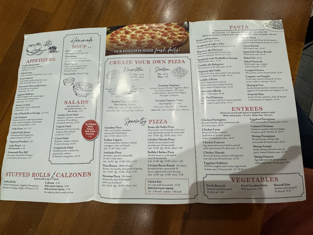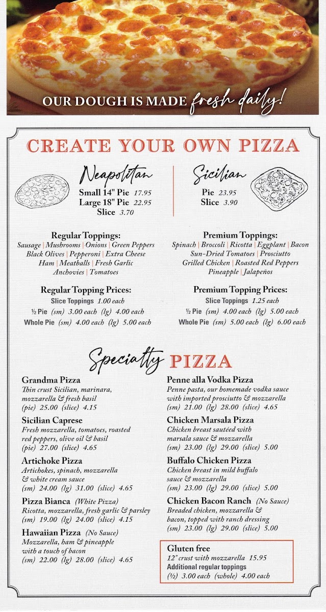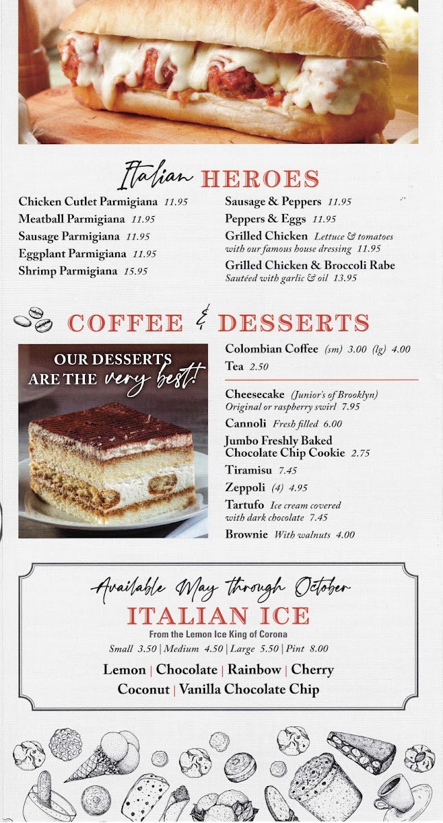 Among the variety of options, you’ll find hand-tossed Neapolitan cheese pizza slices alongside more adventurous choices like chicken marsala or artichoke pizza slices. Italian heroes, such as the grilled chicken & broccoli rabe hero or meatball parmigiana, offer satisfying sandwiches that blend comfort and flavor. For lighter options, fresh salads including Caesar and garden fresh bring a crisp counterpart to the richer mains.